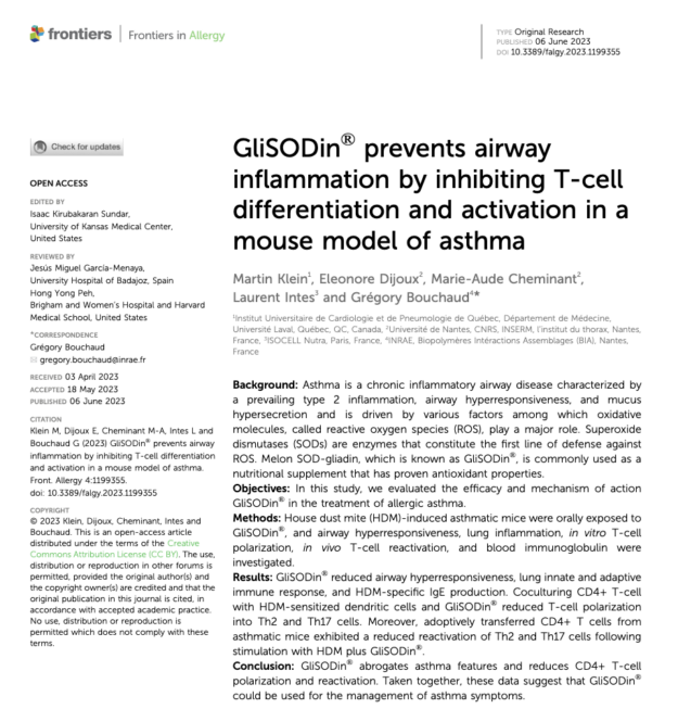 GliSODin® abrogates asthma features and reduces CD4+ T-cell polarization and reactivation. Taken together, these data suggest that GliSODin® could be used for the management of asthma symptoms.