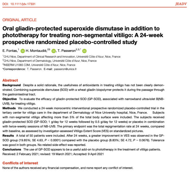 After 24 weeks, a greater improvement in VES was observed in the GPSOD group (19.85%; SE 4.63, P < 0.0001) compared with the placebo group (8.83%; SE 4.72, P = 0.0676). Tolerance was good in both groups. No related side-effect was reported. Conclusions : The use of GP-SOD appears to be a useful add-on to phototherapy in the treatment of vitiligo patients