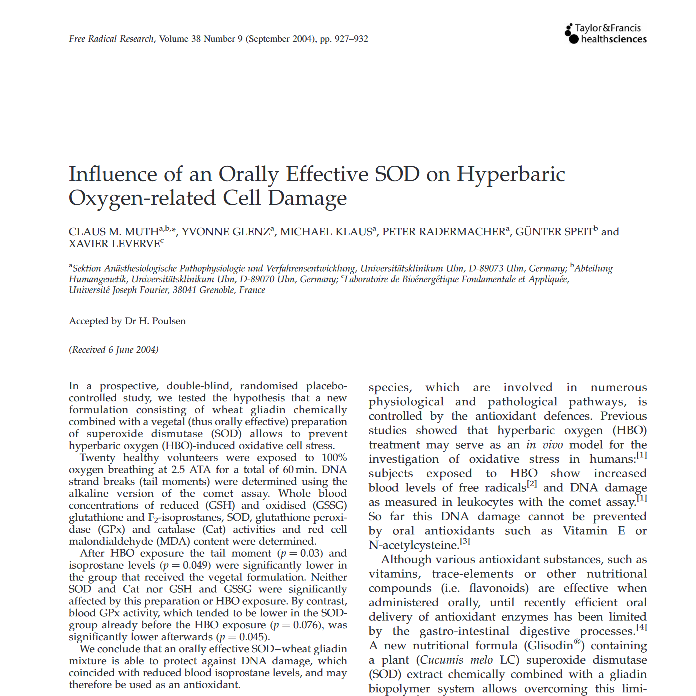 The potential benefits to health of antioxidant enzymes supplied either through dietary intake or supplementation is still a matter of controversy. The development of dietary delivery systems using wheat gliadin biopolymers as a natural carrier represents a new alternative. Combination of antioxidant enzymes with this natural carrier not only delayed their degradation (i.e. the superoxide dismutase, SOD) during the gastrointestinal digestive process, but also promoted, in vivo, the cellular defences by strengthening the antioxidant status. The effects of supplementation for 28 days with a standardized melon SOD extract either combined (Glisodin) or not with gliadin, were evaluated on various oxidative-stress biomarkers. As already described there was no change either in superoxide dismutase, catalase or glutathione peroxidase activities in blood circulation or in the liver following non-protected SOD supplementation. However, animals supplemented with Glisodin showed a significant elevation in circulated antioxidant enzymes activities, correlated with an increased resistance of red blood cells to oxidative stress-induced hemolysis. In the presence of Sin-1, a chemical donor of peroxynitrites, mitochondria from hepatocytes regularly underwent membrane depolarization as the primary biological event of the apoptosis cascade. Hepatocytes isolated from animals supplemented with Glisodin presented a delayed depolarization response and an enhanced resistance to oxidative stress-induced apoptosis. It is concluded that supplementation with gliadin-combined standardized melon SOD extract (Glisodin) promoted the cellular antioxidant status and protected against oxidative stress-induced cell death.